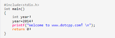 1 2 3 4 5 6 7 8 | #include<stdio.h> int main() { int year; year=2014; printf("Welcome to www.dotcpp.com!n"); return 0; } |