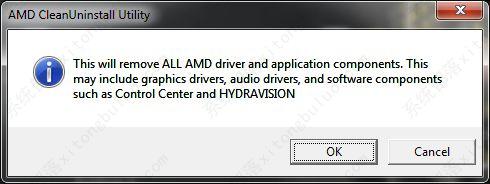 3、会弹出一个警告信息并点击OK确认卸载,点击cancel取消卸载。大致意思是说要卸载全部的AMD显卡驱动程序和应用组件。