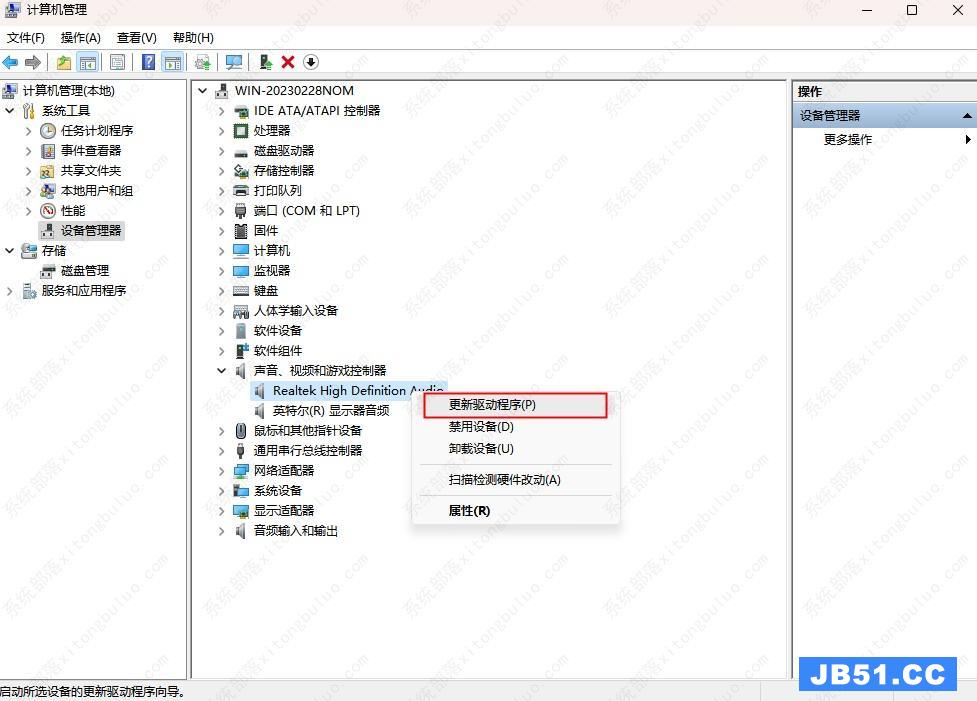 4、右击realtek audio,点击“更新驱动程序”即可。