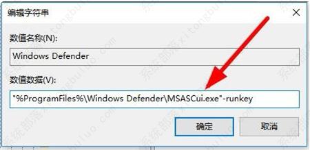 5、双击后打开该字符串的编辑窗口,在窗口中把数值数据修改为“%ProgramFiles%Windows DefenderMSASCui.exe”-runkey,最后点击确定按钮。重新启动计算机后,可以发现Windows Defender的图标已显示出来了。