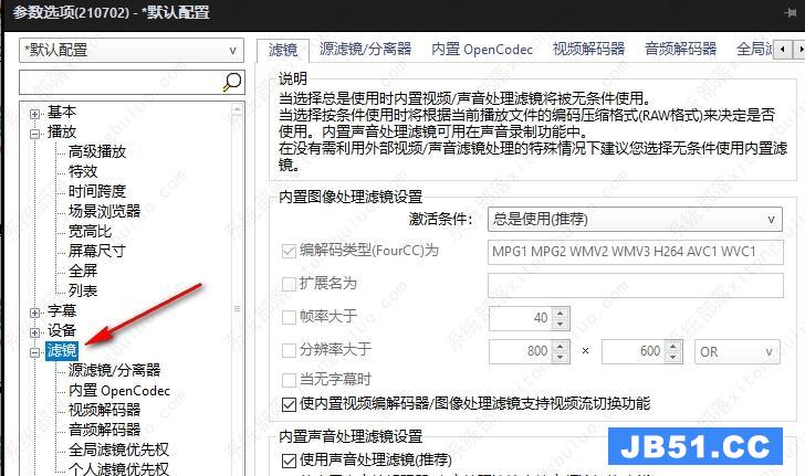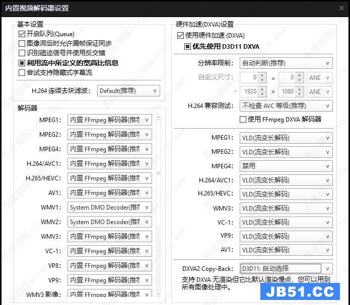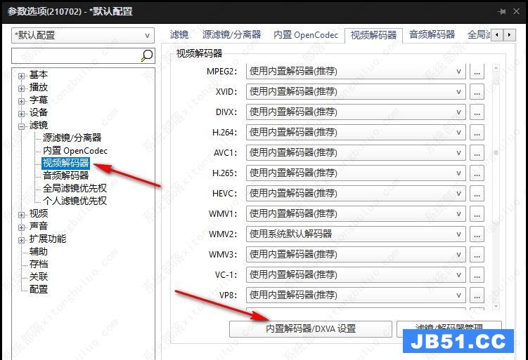 3、第三步,打开“播放”选项之后,我们在右侧页面中点击打开“内置解码器/DXVA设置”选项。