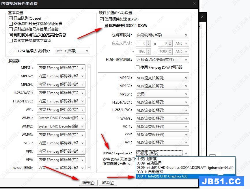 5、第五步,我们将“优先使用D3D11 DXVA”选项进行勾选,或是在页面下方点击“不适用”框,然后在下拉列表中点击选择“D3D11”选项,最后再点击“确定”选项。
