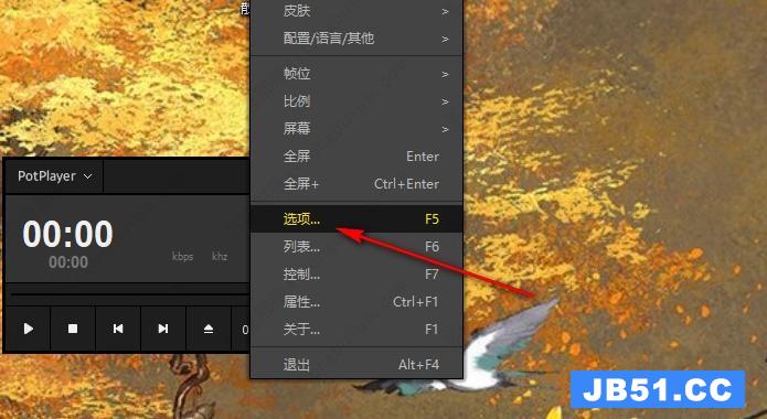 1、第一步,我们先打开potplayer软件,然后在potplayer页面找那个右键单击选择“选项”,或是直接使用“F5”快捷键进入设置页面。