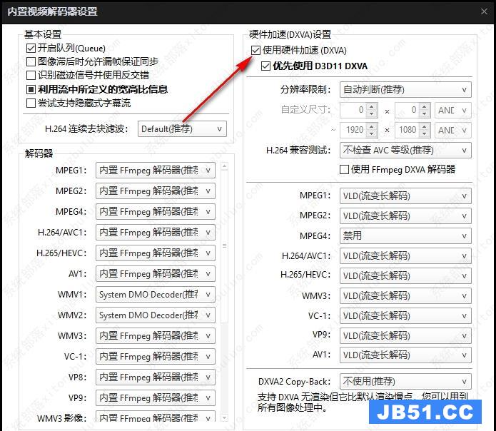 4、第四步,在“内置解码器/DXVA设置”页面中,我们将“使用硬件加速”选项进行勾选。