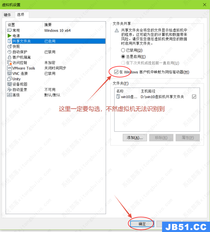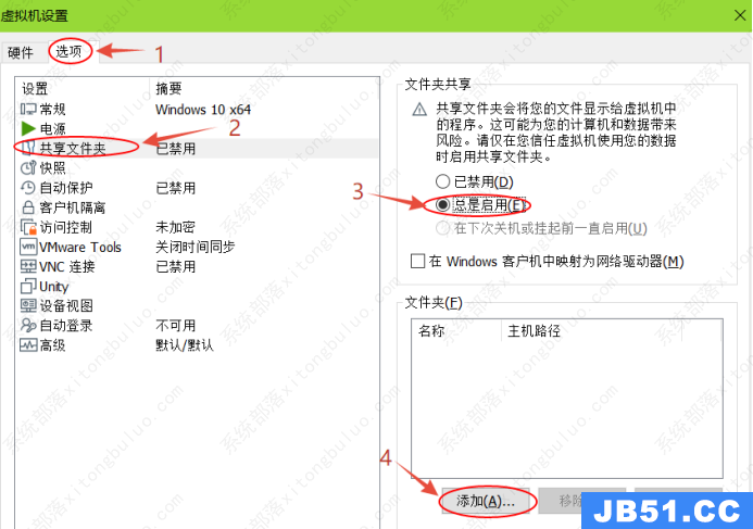 3、选择‘选项’列名,点击‘共享文件夹’,选择‘总是启用(E)’,再点击‘添加(A)’;