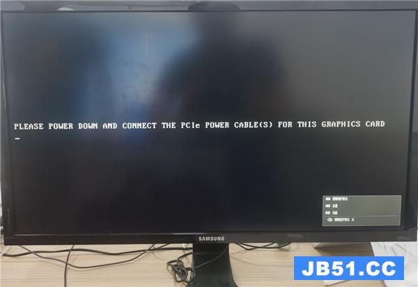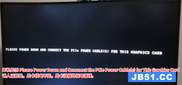 “please power down and connect the pcie power cable(s)for this graphice card”意思是:请关闭电源并连接此显卡的PCIe电源线