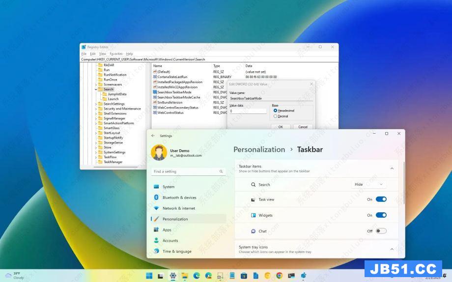 要通过注册表从任务栏中删除搜索框,请使用以下步骤: