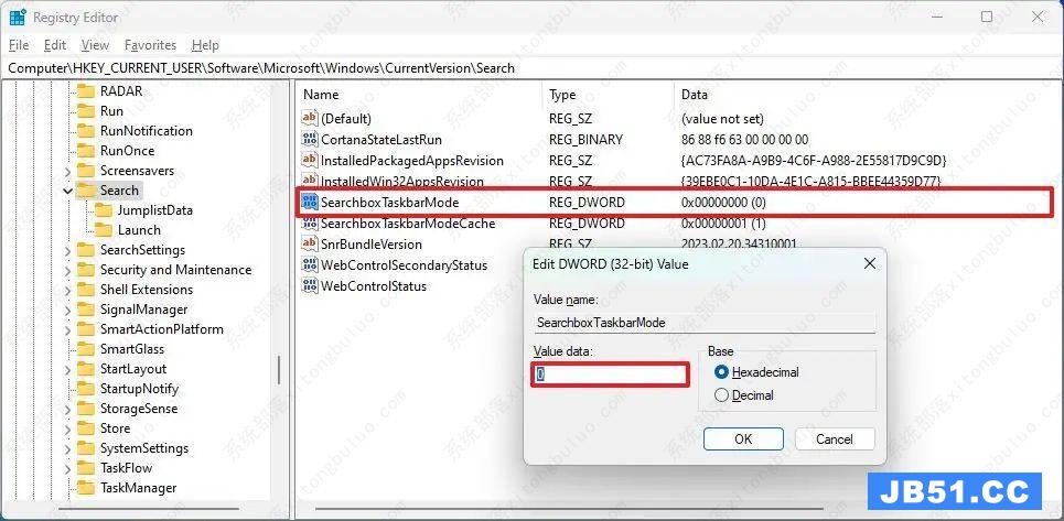 双击SearchBoxTaskbarMode键并将其值设置为0。