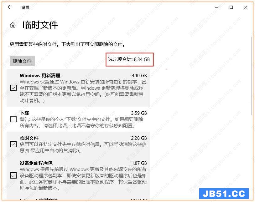 进入后勾选需要删除的文件,选定后可以看到文件大小,最后点击上方的【删除文件】按钮,这样就能删除临时文件了,可以释放大量空间。