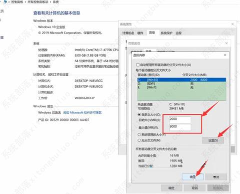 4、输入所要设置的初始大小和最大值,输入完数值后点击设置,确定,退出页面,重启电脑即可。
