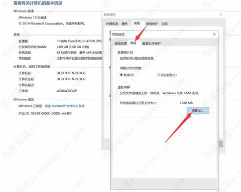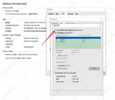 2、切换到高级选项栏,单击更改,勾选自动管理所有驱动器的分页文件大小,其虚拟内存将会被自动分配。