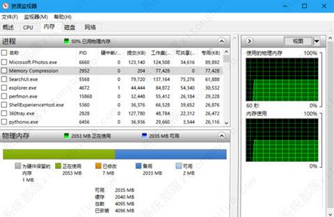 2、想要看是什么进程占用的内存大,可以点击下方的【打开资源监视器】,同样在资源监视器工具栏上找到【内存】选项,点击进去。如果看到有进程自己并没有用到但在后台运行着,导致内存占用过高,则可进入相关软件设置禁用自动开启。