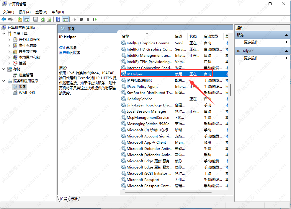 1、右键【我的电脑】-【管理】,在左侧边栏找到【服务】然后双击进入。在列表中找到“IP Helper”系统服务后,右键点击进入属性设置界面。
