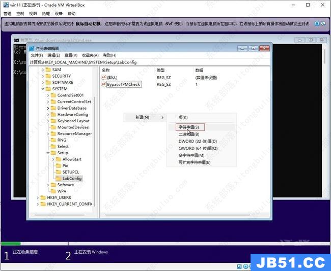 4、点击【LabConfig】,在右侧列表中新建 【BypasstPMCheck】和【BypassSecureBootCheck】两个字符串值,并将数据设置为【1】。