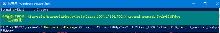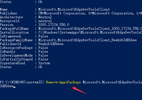 5、接着输入命令 Remove-appxpackage 和 packagefullname包名,用来移除edge包。