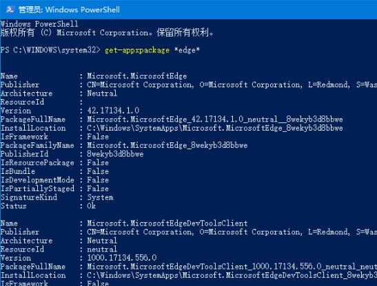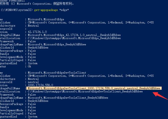 3、输入代码 get-appxpackage *edge*,查找edge包。