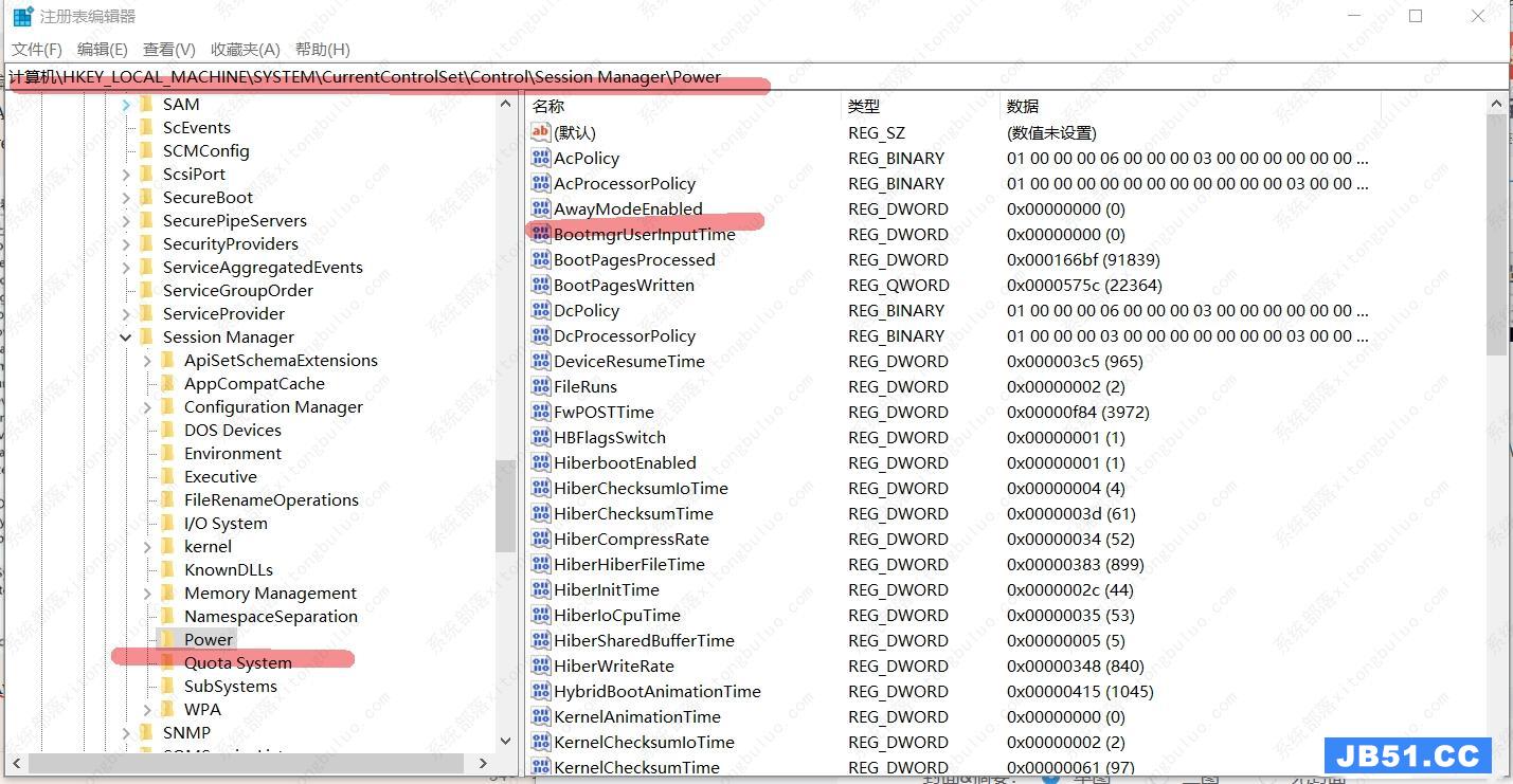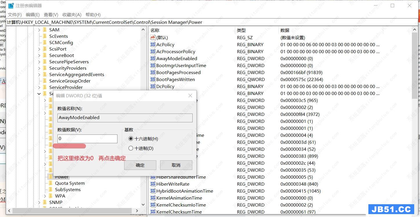 2、在注册表编辑器中依次展开定位到,计算机HKEY_LOCAL_MACHInesYstemCurrentControlSetControlSession ManagerPower”,并找到双击打开AwayModeEnabled值。