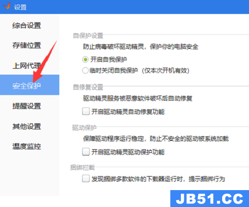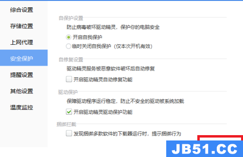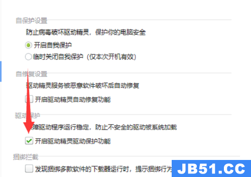 5、然后找到右侧中的“驱动保护”,将“开启驱动精灵驱动保护功能”小方框勾选上。