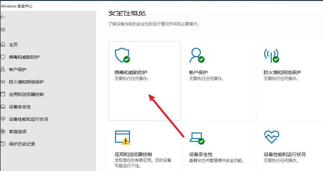 4、进入Windows安全中心,然后找到“病毒和威胁保护”设置。