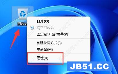 1、首先右键点击桌面上的“回收站”打开“属性”。