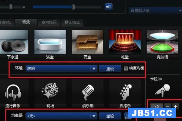 4、进行音效设置,音效主要设置环境和均衡器,这里环境设置为房间,均衡器设置为无,人声消除一般不勾选,卡拉ok设置为0。