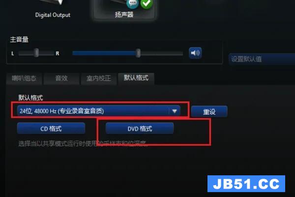 6、进行格露膨式设置,选择DVD格式,这里设置的是24位,48000HZ,这样就设置完成了,设置音频管理器可以拥有更好的音质效果。