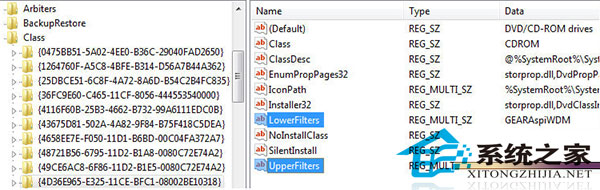 3.在右面的框里找到并删除UpperFilters和LowerFilters(如下图所示的框中寻找UpperFilters和LowerFilters)