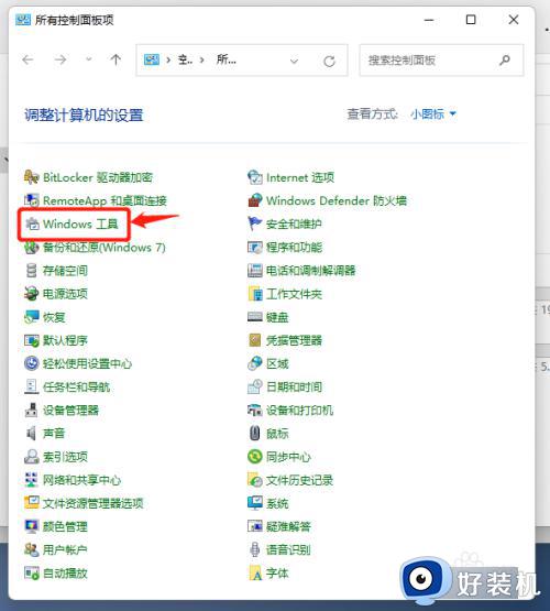 2、在打开的“控制面板”窗口中,点击”Windows工具“。
