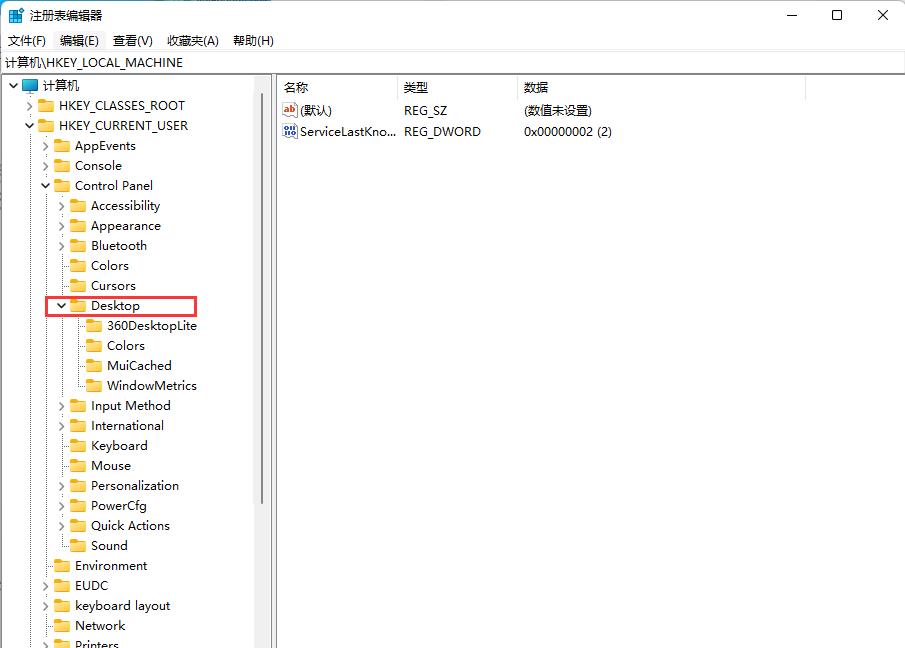 3、打开注册表编辑器并展开HKEY_CURRENT_USERControl PanelDesktop文件夹。如下图: