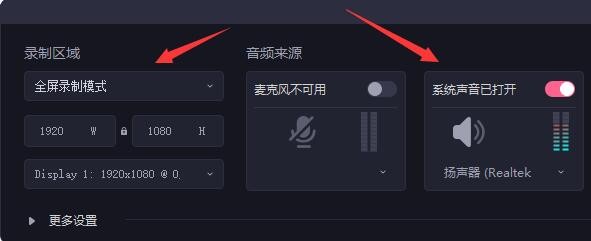 3、在左侧可以修改录制区域,中间可以修改麦克风参数,右边可以修改系统声音设备和音量。