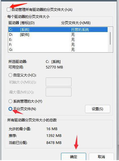 5、最后将上方的【自动管理驱动器的分页文件大小】选项取消勾选,选择驱动器后点击【无分页文件】,再点击【设置】,然后点击【确定】保存修改