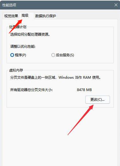 4、接着在【性能选项】界面中再次选择【高级选项卡】,并点击下方的【更改】