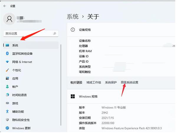 2、然后在界面的【系统】选项卡中点击【关于】,并点击关于界面的【高级系统设置】