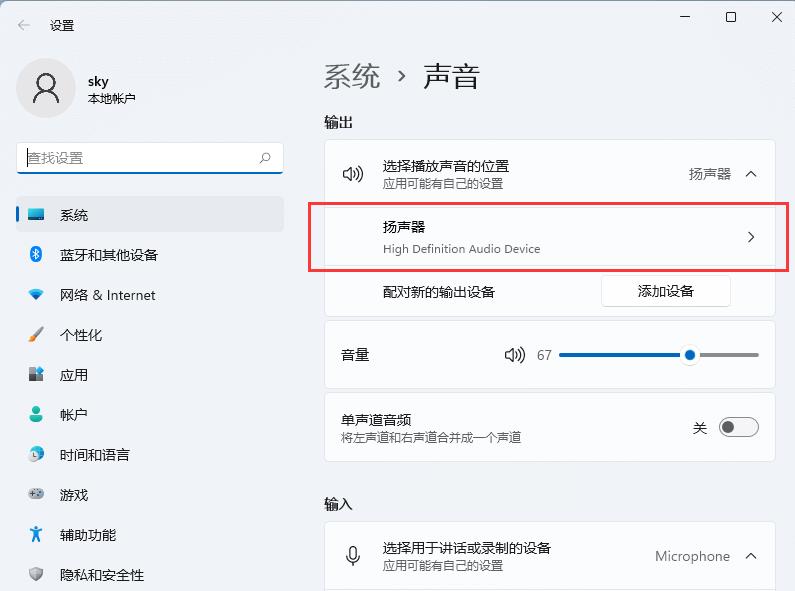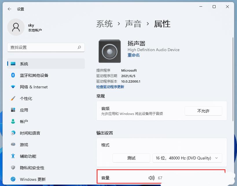 3、当前路径为:系统>声音>属性,在输出设置下调整音量;