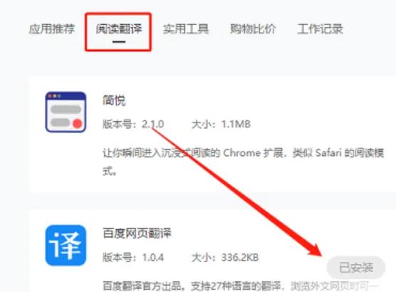 2、切换到“阅读翻译”插件,找到并安装“百度网页翻译”插件。
