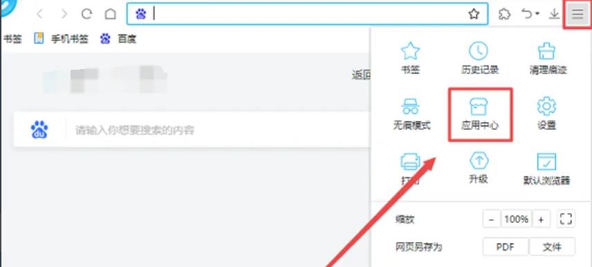 1、打开联想浏览器,点击右上角的三条横线按钮,选择“应用中心”。