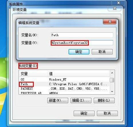 4、最后在环境变量界面的【系统变量】中找到【Path】选项并双击打开,在打开界面中将【变量值】设置成【%SystemRoot%\system32】,再点击【确定】即可