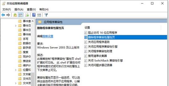 2、在本地组策略编辑器窗口中,展开“计算机配置-管理模板-Windows组件-应用程序兼容性”,双击打开右侧的“删除程序兼容性属性页”;