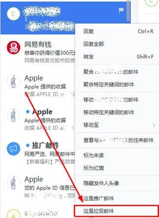 2、第一种办法,选择不想看到的邮件,点击右键,选择“这是推广邮件”选项,如下图: