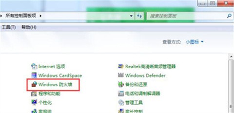 1、单击开始菜单,打开控制面板,点击“Windows防火墙”。