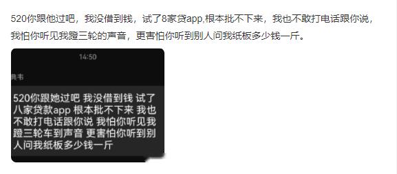 5、520你跟他过吧,我没借到钱,试了8家贷app,根本批不下来,我也不敢打电话跟你说,我怕你听见我蹬三轮的声音,更害怕你听到别人问我纸板多少钱一斤。