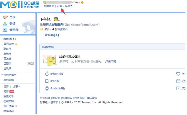 1、打开QQ邮箱后,点击顶部的“设置”按钮。