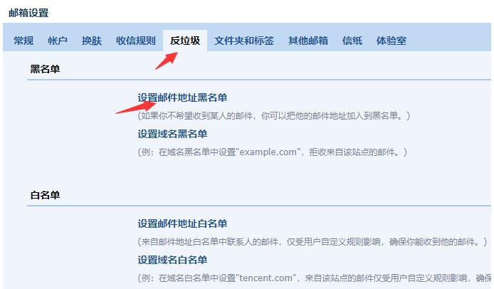 2、在邮件设置界面,单击“反垃圾”选项,然后单击“设置邮件地址黑名单”。