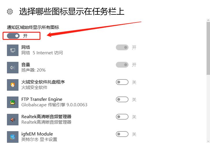 4、最后在打开的界面中将【通知区域始终显示所有图标】下方的开关打开即可