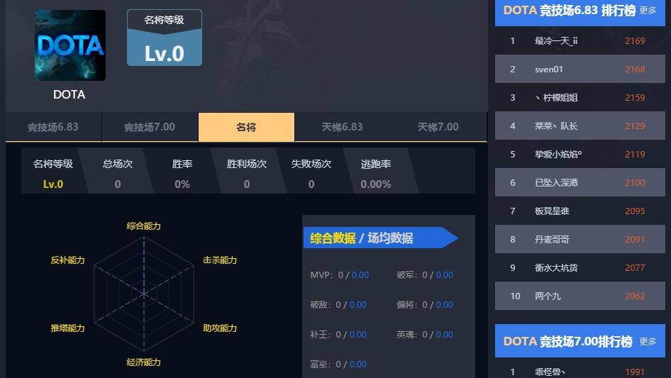 2、进入游戏后,可以看到DOTA等成就,如战局、胜率、胜败等,并会有详细的综合、逆转、击杀、推塔、经济、助攻等五线图,以及MVP、失败等综合统计。