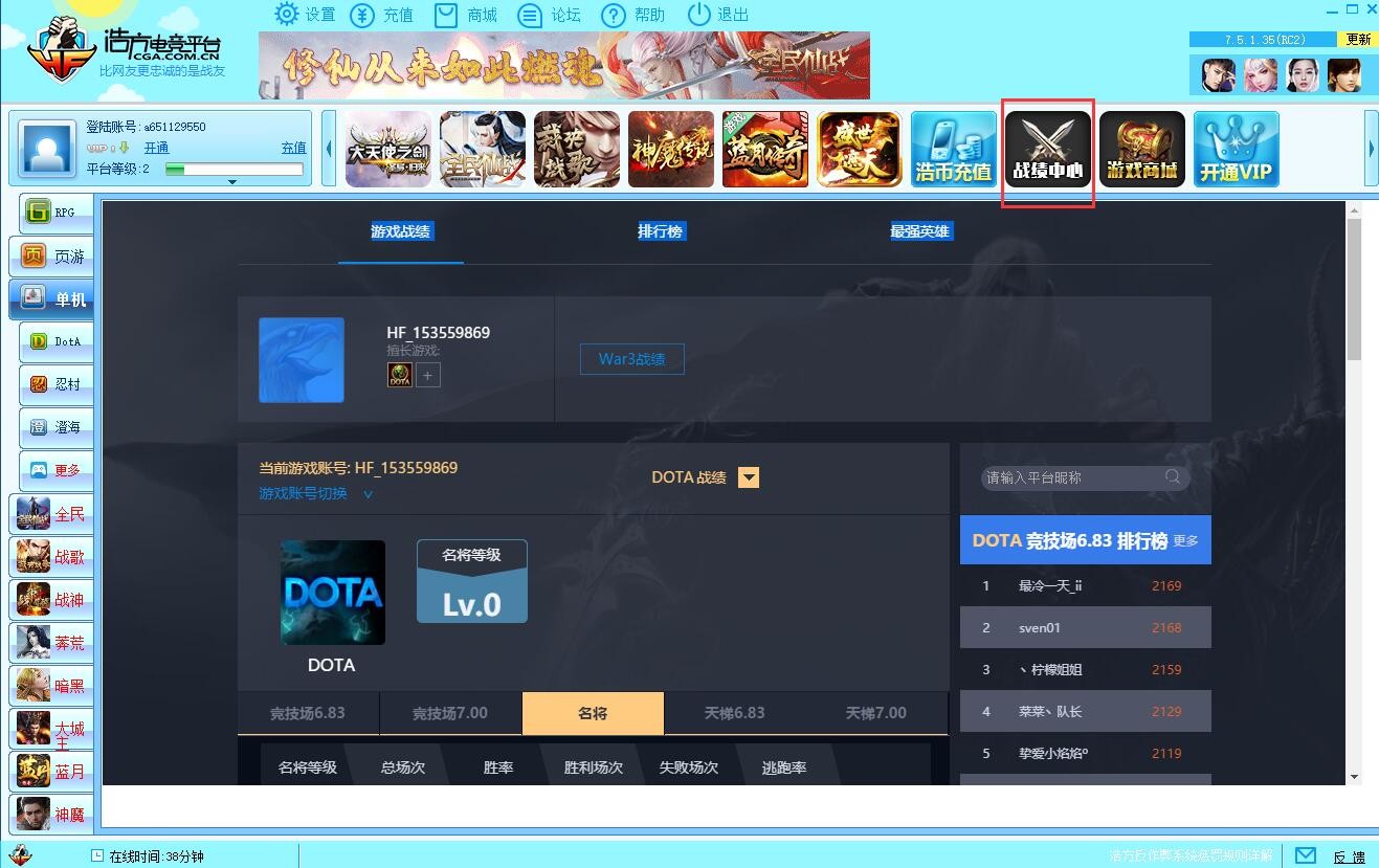 1、点击下图红框中的战斗中心,在浩方平台的功能栏中。它被一组页面游戏挡住了,你需要按下按钮→才能看到它。