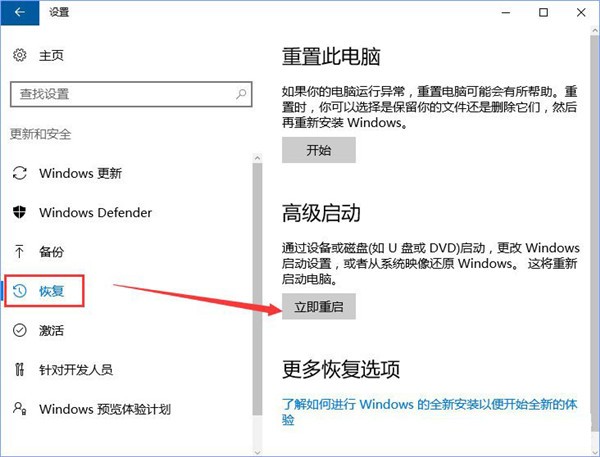 3、打开更新和安全,在左侧的“修复”,然后在高级启动中单击“立即重启”按钮;