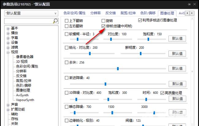 4、然后找到右侧中的"倍帧(创建中间帧)",将其小方框勾选上,最后点击应用确定就可以了。