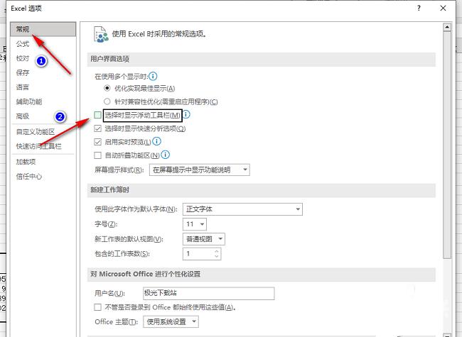 3、进入到新窗口后,点击"常规"选项,然后找到右侧中的"选择时显示浮动工具栏",将其小方框取消勾选,最后点击"确定"保存即可。