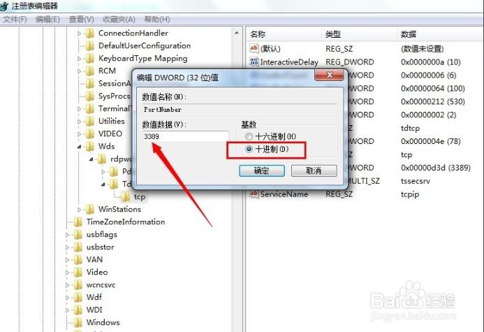 双击点击PortNumber值,我可以看到默认的win7远程桌面端口是3389,然后我们可以把它修改成自己需要的端口号码,并选择十进制,点击确定,重启电脑即可生效。